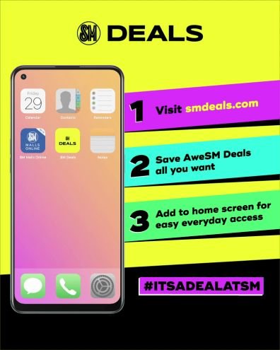 SM Deals can also be availed through SM Malls Online. Simply download the SM Malls Online app at the App Store or Google Play store then create an account and register. Next, simply type in your delivery address location, select your preferred participating mall and you can now begin shopping exciting deals and enjoy more savings.