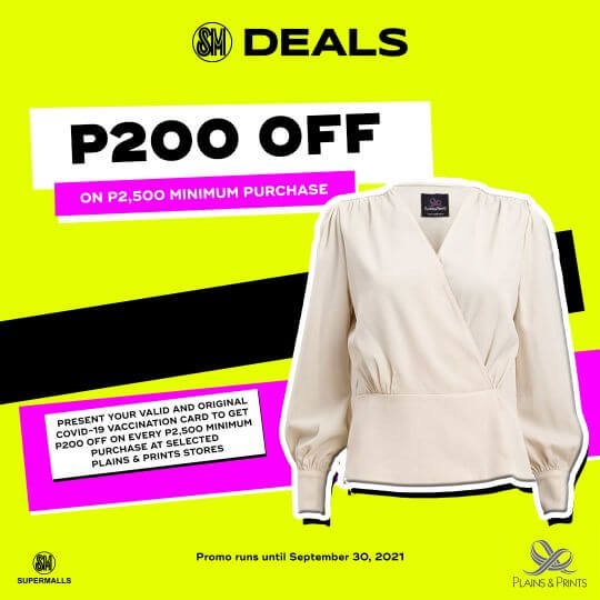• Plains and Print at SM Deals. Present your valid and original Covid-19 vaccination card to get P200 Off on every 2500 minimum purchase at selected Plains and Print stores. Promo runs until September 30, 2021.