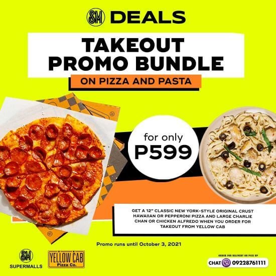 • Get a 12” Classic New York-Style Original Crust Hawaiian or Pepperoni Pizza and Large Charlie Chan or Chicken Alfredo when your order for takeout from Yellow Cab at smdeals.com. Promo runs until October 3, 2021.