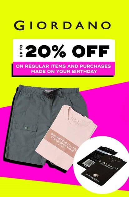• Get a Giordano Privilege card and enjoy the following loyalty perks: 10% off on all regular items, 15% off on your birthday month and 20% off on your birthday for a minimum cumulative purchase of P10,000 per year! Valid until December 31, 2021