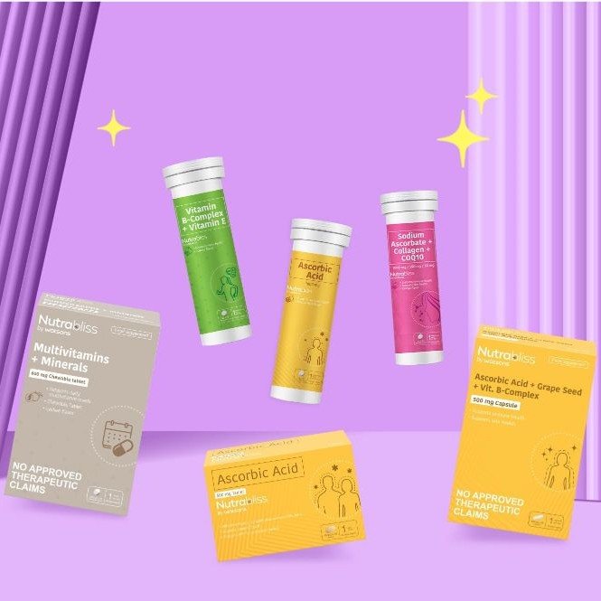 • There’s bliss in the fizz.Another fun way to take your vitamins and supplements is through effervescent tabs, which readily dissolve in water.  These include Nutrabliss Ascorbic Acid Effervescent Tabs in passion fruit flavor packed with 1000 mg of vitamin C essential for the growth, development, and repair of all your body tissues;  Nutrabliss Vitamin B-Complex + Vitamin E Effervescent Tabs; and Nutrabliss Sodium Ascorbate + Collagen + COQ10 Effervescent Tabs with sodium ascorbate for immunity, collagen for skin health, and coenzyme Q10 as an antioxidant.