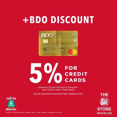• PLUS! BDO Credit Card cardholders get an extra 5% discount with a minimum single-receipt purchase of P5,000 this weekend.