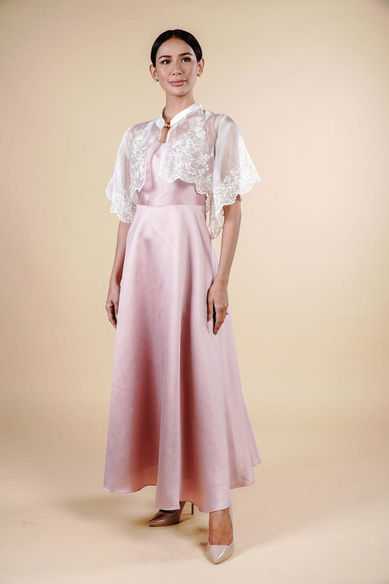 6. Delicately embroidered organza bolerowith scallop edges worn over a pink gazer gown.