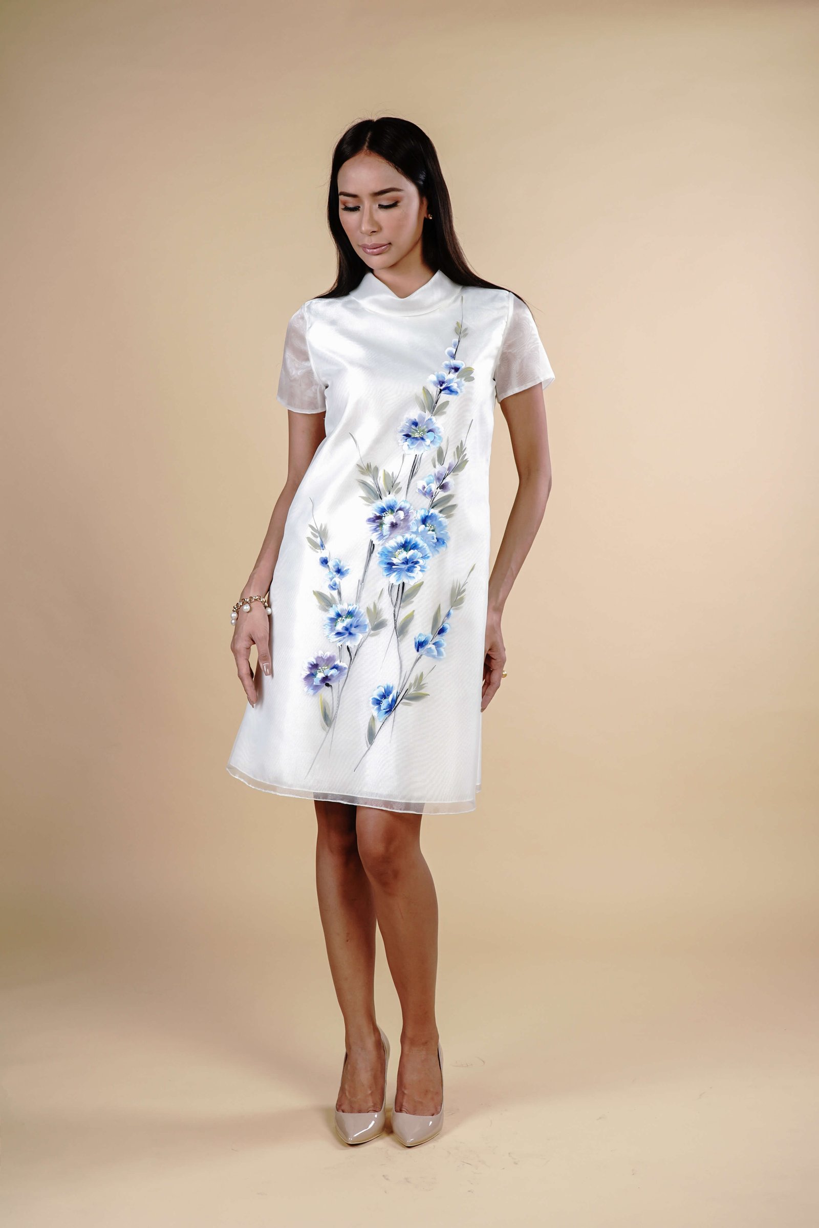 7. Delightful hand painted and hand embroidered floral accents highlight this white organza dress.