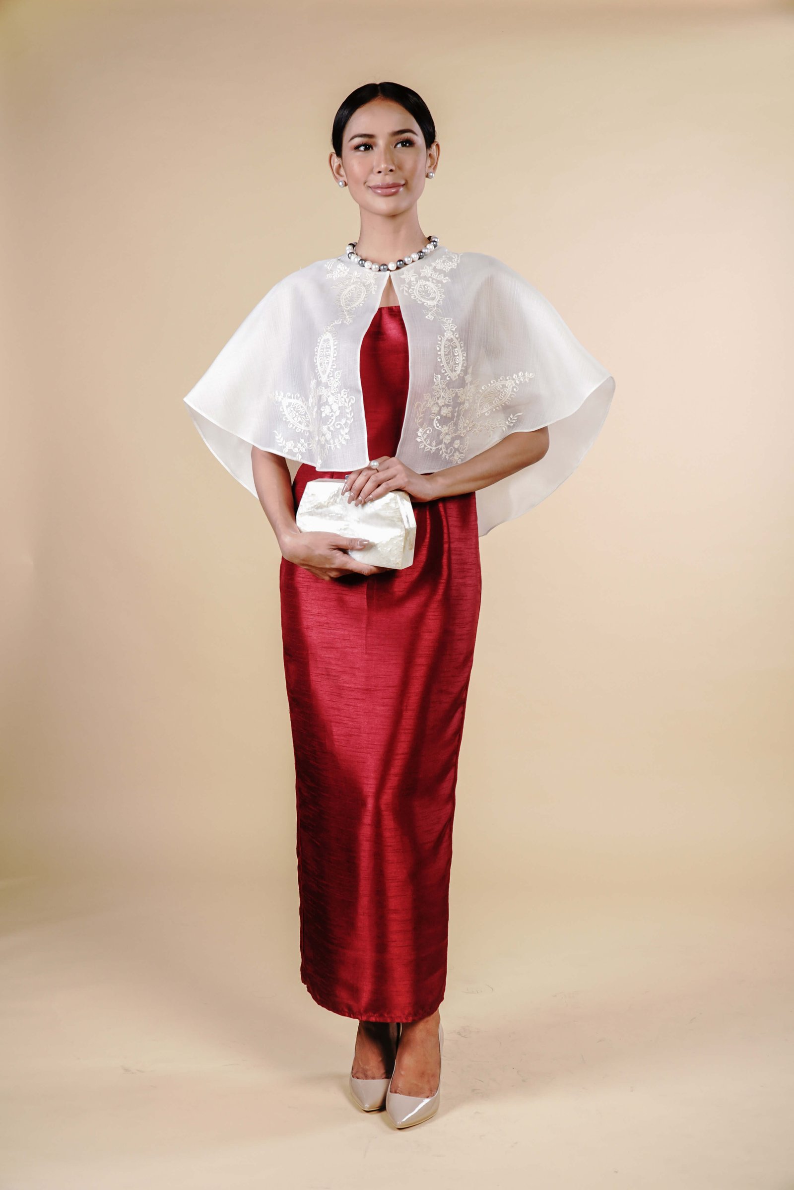 A cropped terno top worn with slim silk pants . . . Art Deco inspired black embroidery on a white silk terno top and ruffled skirt . . . an exquisitely embroidered capelet over a red shantung silk gown . . . a playful inabel terno top with pineapple designs.