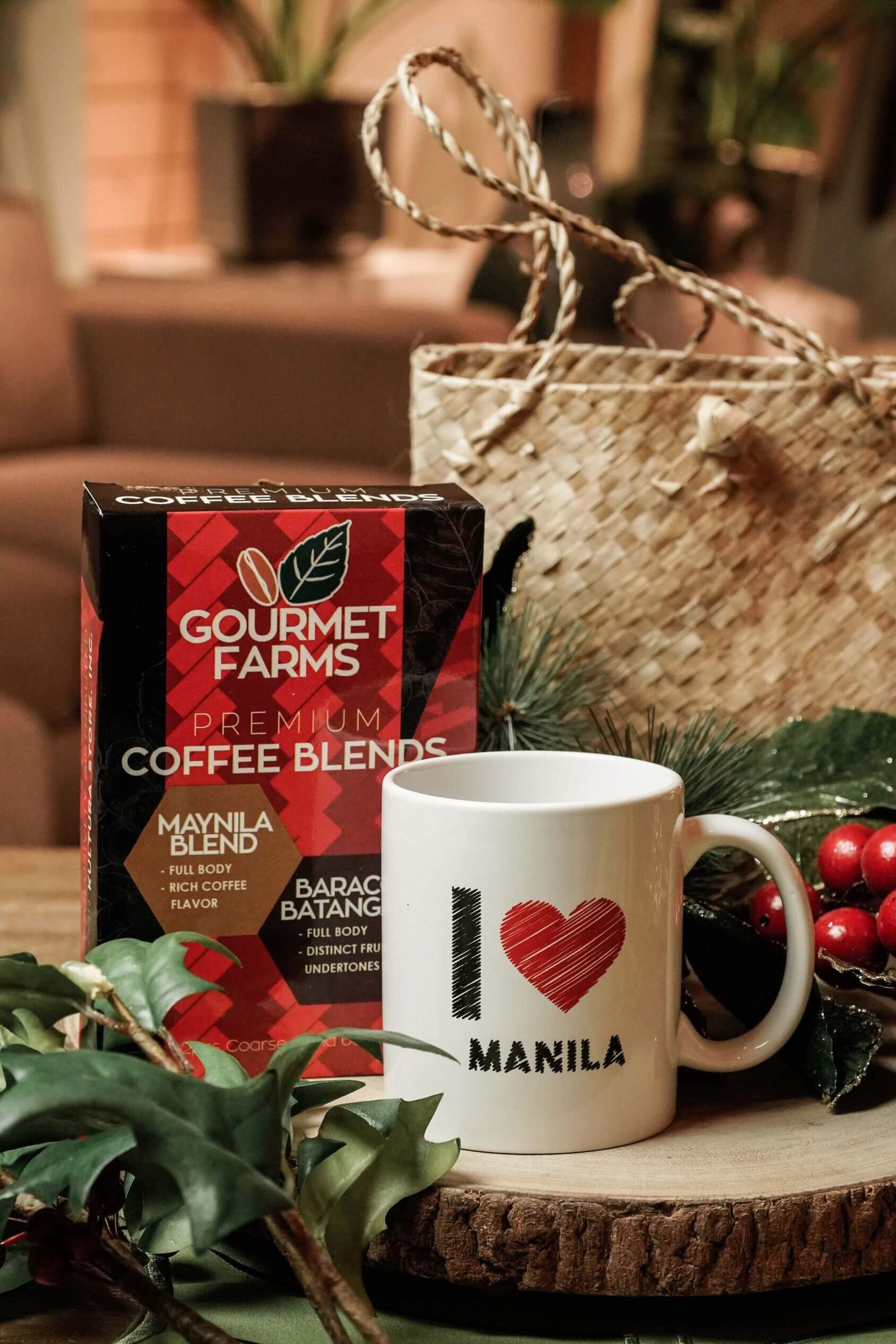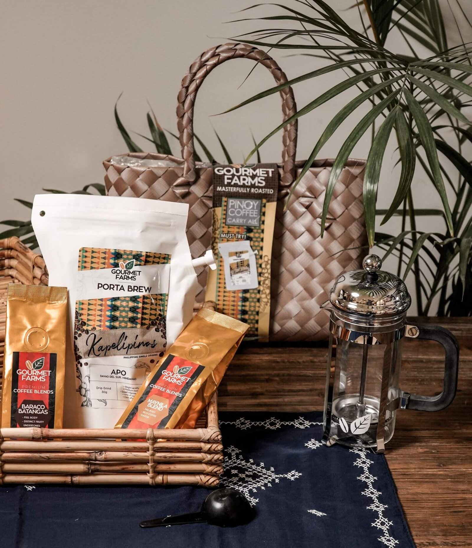- Regalo para sa Coffee Lover. Coffee sampler set from Gourmet Farms featuring premium beans from around the Philippines. The set includes Baraco Batangas coffee, Maynila Blend, Apo Coffee from Davao, and a lovely French press, encased in a reusable plastic bayong.